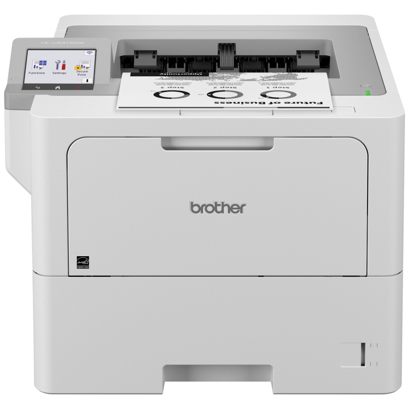 The Brother HL-L6415DW enterprise monochrome laser printer offers enterprise-level performance, advanced security features, and reliable, high-quality output for mid- to large-sized workgroups. It helps increase productivity with a fast print speed of up to 52 ppm1 and features a large, expandable paper capacity that grows with your business. Enjoy built-in value with an included super high-yield toner cartridge and a low total cost of ownership by using the TN925 Brother Genuine max yield replacement toner cartridge. Triple Layer Security features help to limit document and device access and protect against network intrusions. Flexible connectivity with built-in Gigabit Ethernet and dual band wireless networking, plus convenient printing from mobile devices2 help simplify your business operations. 1 Based on one-sided printing. Change from default setting required. 2 Additional download required. Compatibility may vary by device or operating system. Wireless connection may be required.