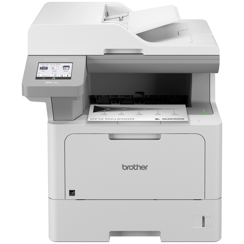 The Brother MFC-L5715DW business monochrome laser all-in-one printer is a great choice for busy offices and small workgroups that need low-cost printing, versatile paper handling, advanced security features, and reliable, high-quality output. It helps increase productivity with fast print and copy speeds up to 48 ppm1 and delivers built-in value with an included super high-yield toner cartridge and low-cost printing by using the TN920UXXL Brother Genuine ultra high-yield replacement toner cartridges. A large, expandable paper capacity comes in handy as your business needs grow. Flexible connectivity with built-in Gigabit Ethernet and dual band wireless networking, plus convenient printing from mobile devices2 streamline your operations while Triple Layer Security features help limit document and device access and protect against network intrusions. 1 Approximate toner cartridge yield in accordance with ISO/IEC 19752 (letter/A4). 2 Additional download required. Compatibility may vary by device or operating system. Wireless connection may be required.