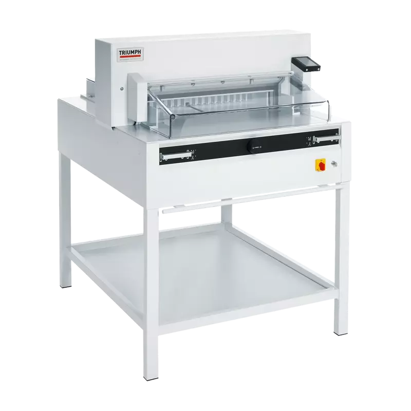 Programmable cutter with automatic clamp, power back gauge, and digital touch pad. Cutting width is a full 25 1/2 inches. Ergonomic, 37 inch working height. Electric blade and clamp drive. Electric back gauge drive with touchpad for easy programming. Digital measurement display (cm or inches) with multilingual operator guidance, accurate to 1/10 mm or 1/100 inch. Stores 99 programs with up to 99 steps in each (up to 15 repeat cuts can be integrated as a single step). Pre-programmed for standard paper sizes. Memory key for repeat cuts. Automatic SET function for reference measurement and EJECT function for pushing out paper. Self-diagnostic system with error indication on display. Electronic hand wheel with variable speed control for manual back gauge setting. Bright, LED optical cutting line. Adjustable, spindle guided back gauge with narrow separations and plastic gliders. Dual side guides on front and rear tables. High quality, German steel blade. Solid steel blade carrier and adjustable blade guides. All-metal construction. Includes stand with storage shelf, easy-access tool holder, and paper blocking tool. Optional side tables increase work surface. UL and C UL approved.