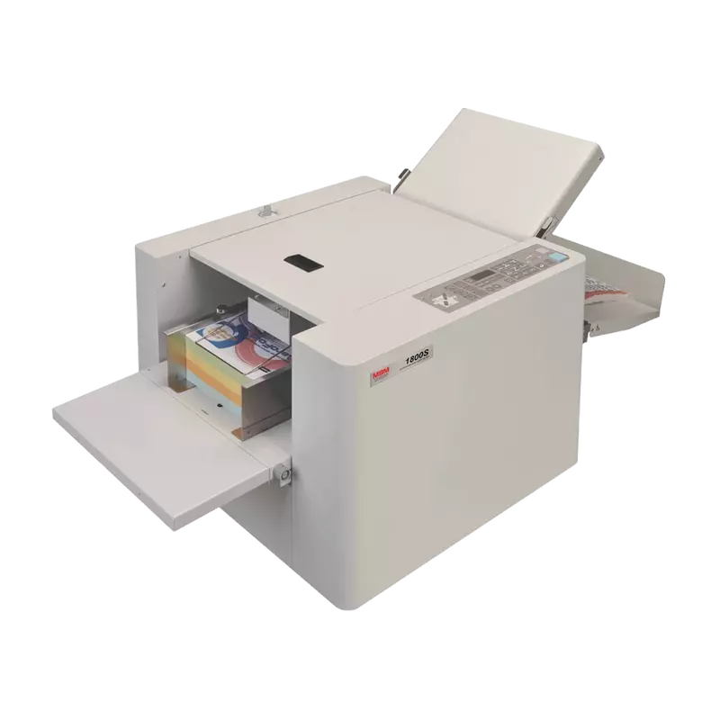 Automatic air feed folder perfectly suited for digital work. 30 custom folds and non-standard paper sizes can be stored in memory. The 1800S by MBM is the new and improved model of the 1500S. The ultrasonic double feed sensor is new to this model. The 1500s could not detect double feeds on black or transparent sheets, but the new 1800s detects double feeds on any white, printed, transparent, black or mixture of coloured sheets. Also new to the 1800S is the removable folding roller for easy maintenance, the adjustable folding roller pressure, and a spring loaded feed angle adjustment dial. The machine top cover opens and closes in two easy steps and the operator can now reach the air adjustment know without disruption when the top cover is open. New "silver top" metal sheet for smoother paper run and better electric conductivity. Top feed, adjustabel air suction feed system, suitable for digitally printed and coated stocks. Pre-programmed with 6 standard folds. Stores 30 custom folds in memory. One-touch memory keys for custom folds. non-standard paper sizes can be stored in memore. Control touch panel includes 4 digit counter with batch and total functions. Test button folds 2 sheets for inspection. Extended exit tray for neat stacking of folded sheets. Automatic feed table ensures optimum feed pressure. Automatic conveyer belt and self-settling rollers ensure smooth ejection of folded paper. Single sheet feeding automatically maintained for differenct weights of paper. Display alert and audible signal in case of incorrect operaion. Skew and micro-adjustment dials. All-metal construction. Optional micro-perforator, and scorer.