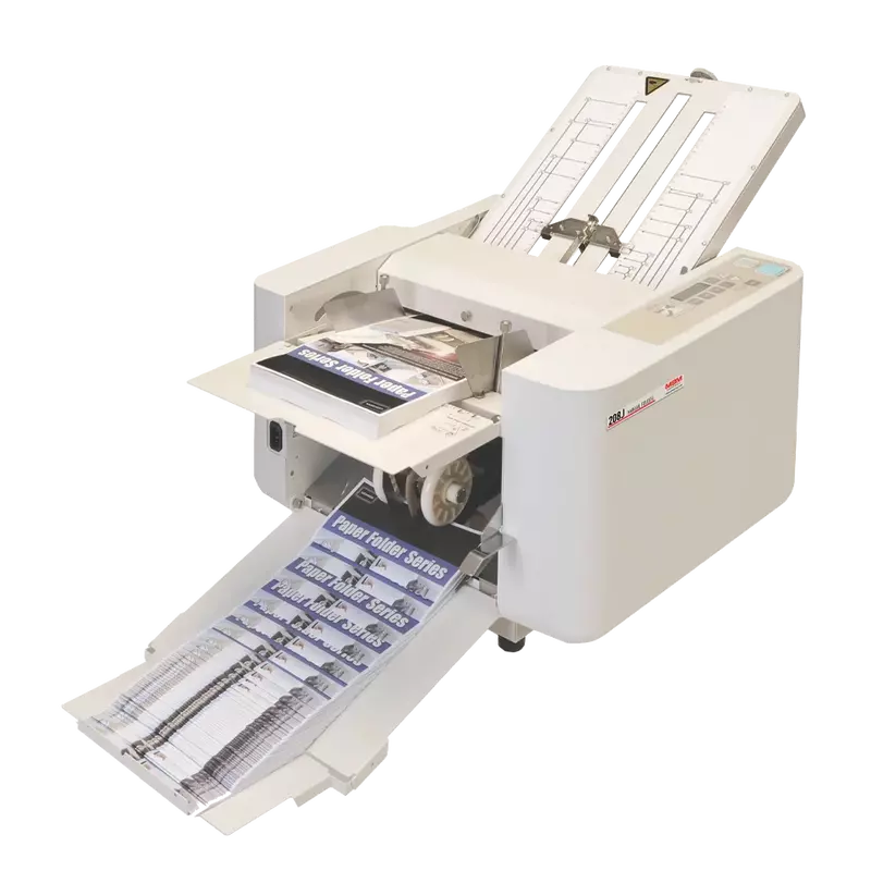 Friction feed manual folder that sets up easily for a variety of standard and custom folds. 3 roller friction system. Easy set-uo for standard and custom folds. Control touch panel includes 4 digit counter with addition and subtraction functions. Test button folds 2 sheets for inspection. Extended exit tray for neat stacking of folded sheets. Automatic conveyer ensures smooth ejection of folded paper. Single sheet feeding automatically maintaned for different weights of paper. Auxilary paper guide for cross folding. Load and unload paper from the same side. Display alert and audible signal in case of incorrect operation. Skew and micro-adjustment dials. Quick-release roller system for easy maintenance.