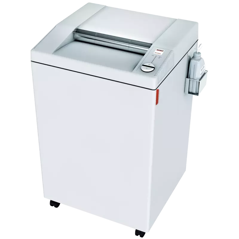 Our most powerful Centralized Office shredder comes with an autmatic oiler and ECC (Electronic Capacity Control). Automatic start and stop controlled by photo cell. Patented Electronic Capacity Control (ECC) indicator prevents jams by monitoring sheet capacity levels during operation. Automatic oil injection ensures optimal performance at all times. High quality, hardened steel cutting shafts take staples, paper clips, credit cards, and CDs / DVDs (strip- and cross-cut models). High security models meet all NSA/CSS specifications and are DOD approved. Lifetime warranty on the cutting shafts (strip- and cross-cut models). 1 year warranty on high security cutting shafts. Quiet and powerful single phase motor rated for continuous operation. Sturdy chain drive with fully enclosed gear box housing. High quality wooden cabinet mounted on casters. Convenient, environmentally friendly shred bin does not require disposable shred bags.