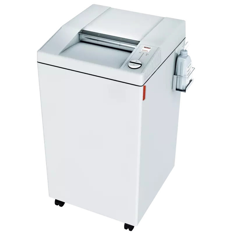 Automatic oil injection system ensures optimal performance at all times. High speed and sheet capacity make it ideal for high volume shredding.Automatic start and stop controlled by photo cell. Patented Electronic Capacity Control (ECC) indicator prevents jams by monitoring sheet capacity levels during operation. Automatic oil injection ensures optimal performance at all times. High quality, hardened steel cutting shafts take staples, paper clips, credit cards, and CDs / DVDs. Lifetime warranty on the cutting shafts. Quiet and powerful single phase motor rated for continuous operation. Sturdy chain drive with fully enclosed gear box housing. High quality wooden cabinet mounted on casters. Convenient, environmentally friendly shred bin does not require disposable shred bags.