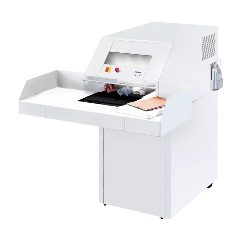 Powered conveyor belt feed system. Convenient centralized oiler for lubrication of the cutting shafts. Safety lock and key, main switch, and emergency stop button. Automatic power cut-off when cabinet is opened or shred bag is full. Automatic reverse and power cut-off when overfed. Thermal switch prevents overheating. Removable side tables provide large work space. Push button control panel with optical indicators to show operational status. Soft metal resistant, hardened steel cutting shafts take CDs / DVDs and hardbound documents. Lifetime warranty on the cutting shafts. High powered 3 phase motor rated for continuous operation. Fully enclosed gear box housing. Mounted on heavy duty casters. Rear opening cabinet door and mobile shred bag suspension frame for easy replacement of shred bags.