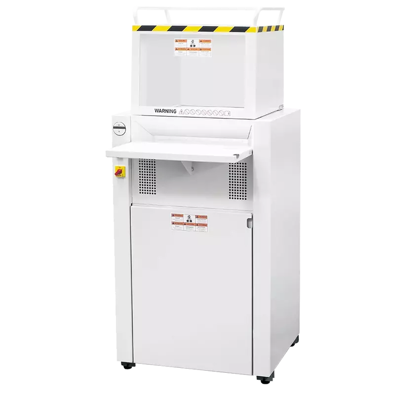 Space saving High Capacity shredder with automatic oiler and unique feed hopper for bulky material. Equipped with a conventional feed slot for flat paper stacks. Open tilting feeding hopper for crumpled paper. Feeding paddle for effective insertion of crumpled paper and computer prinouts with automatic start/stop via a photo cell. EASY-SWITCH - intelligent multi-function control element indicating the operational status of the shredder with varying colour codes and back-lit symbols. Electronic control prevents over feeding: automatic reverse and re-feeding in case of paper jams. Fold-away feeding table. Main switch and emergency cut-off siwthc. Robust shredding heads with special hardened cutting shafts made of high quality steel, resistant against soft metal objects. Automatic oil injection on the cutting shafts during shredding operation for contstant high shred performance. Automatic stanby after 30 minutes. Powerful three phase motor with therman motor protection. Front door and mobile shred bin for easy removal of the full shred bag. High volume container for the shredded material. Tilting hopper for cleaning acess. Automatic stop when hopper or front door is opened, or when the shred bin is full. Mobile on castors